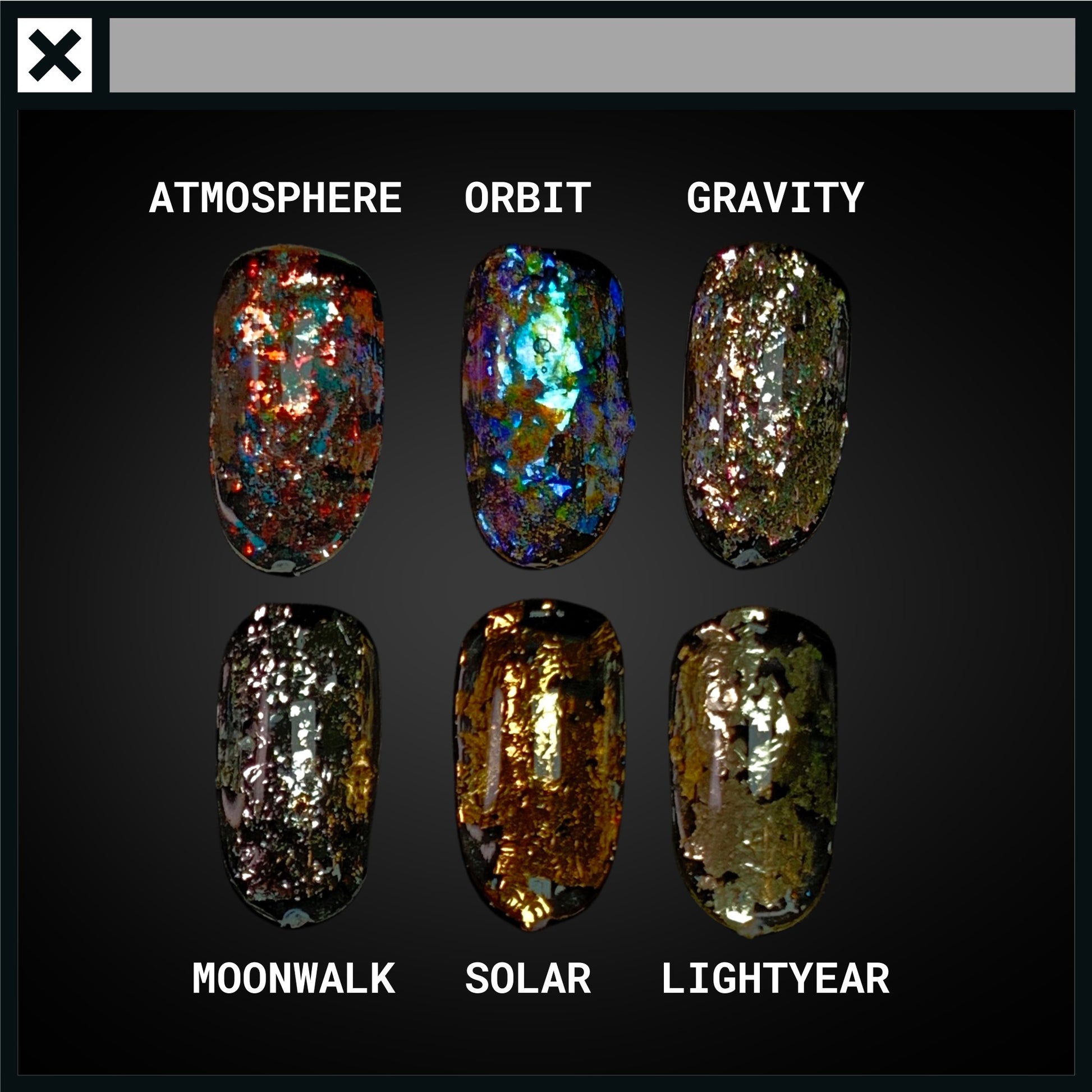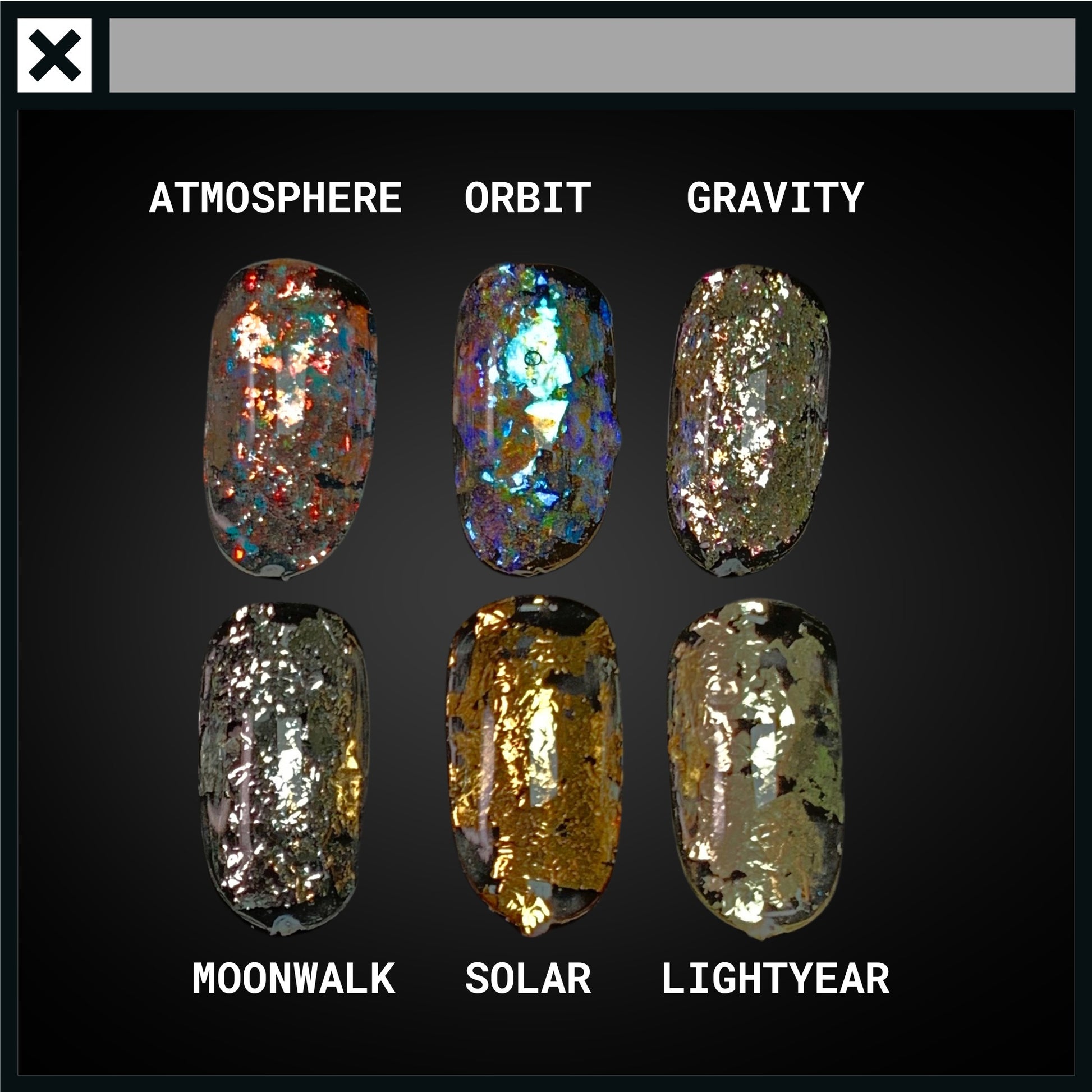 Prepare yourself to be launched into space because these flakes are out of this world. Seriously thin, meaning you won't need to grab that builder gel to encapsulate. Just use your fav high viscosity topcoat (we love Hi-Def Gloss Topcoat). This collection comes in 3 iridescent shades (Atmosphere, Orbit, and Gravity) along with 3 classic metallic foil shades (Moonwalk, Solar, and Lightyear).