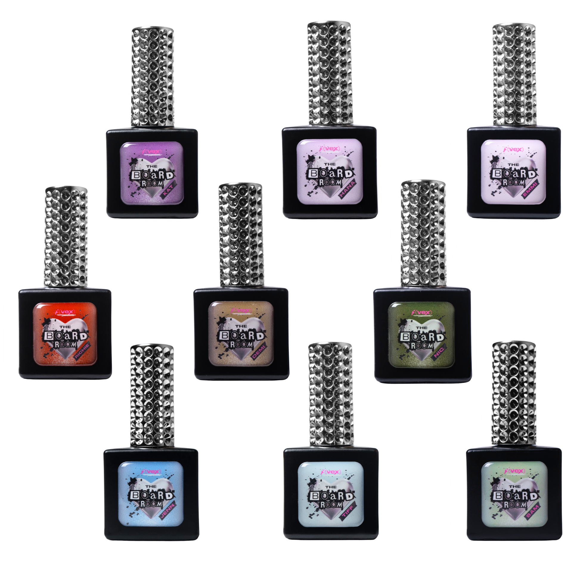 A collection of 9 muted shades with subtle silver foil shimmer throughout. These semi-sheer shades are easily layered for different effects. 1 coat for a wash of muted milky color, 2 coats for a more opaque and impactful finish. Cure for 30 seconds in a UV/LED lamp with a power rating of at least 48W.