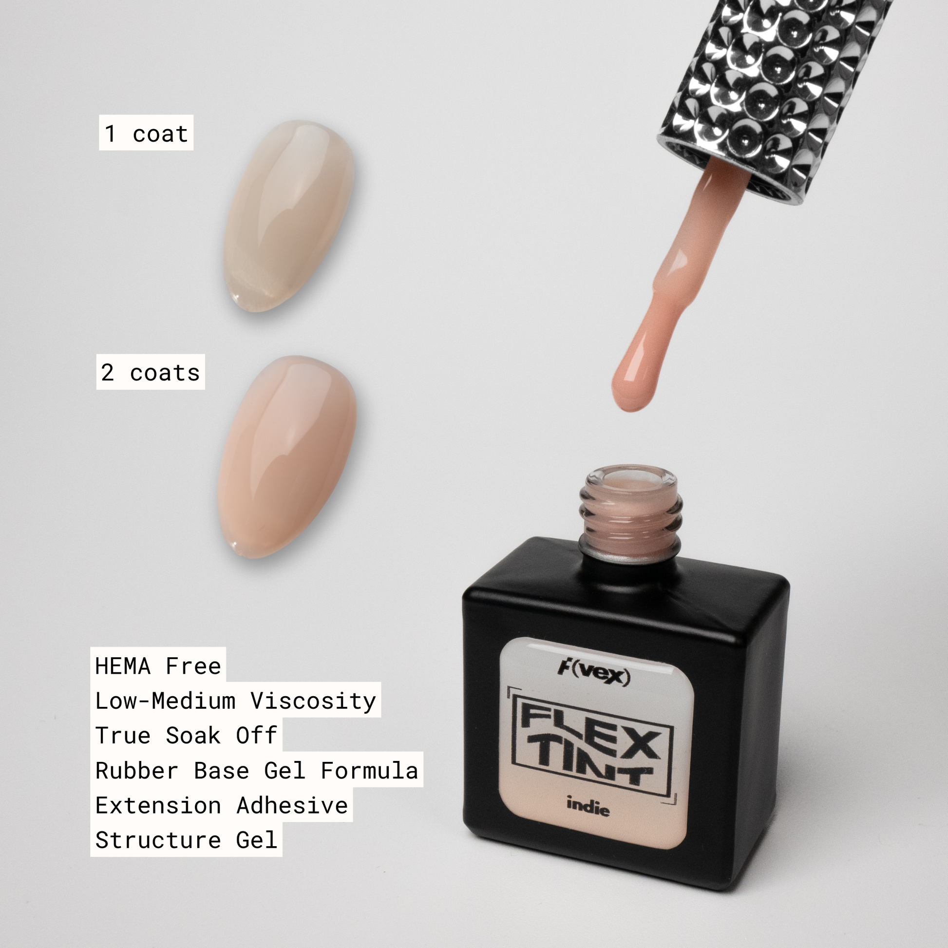 Flex Tint is a soak-off, flexible base gel with low-to-medium viscosity for easy self-leveling and smooth, thin application. This formula is a cleaner, gentler version of our original Flex Base—ideal for sensitive clients or anyone looking for easy removal without damage.