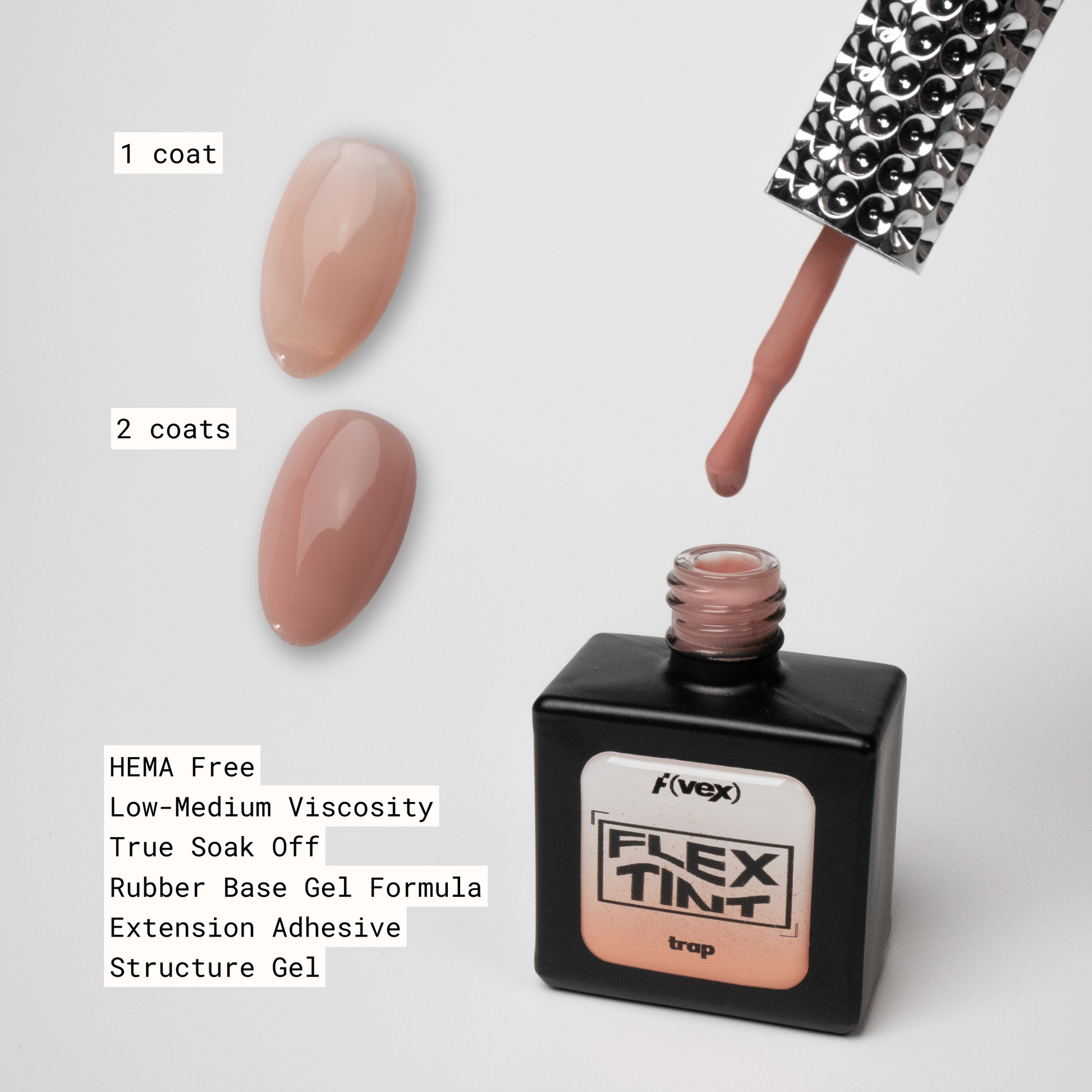 Flex Tint is a soak-off, flexible base gel with low-to-medium viscosity for easy self-leveling and smooth, thin application. This formula is a cleaner, gentler version of our original Flex Base—ideal for sensitive clients or anyone looking for easy removal without damage.