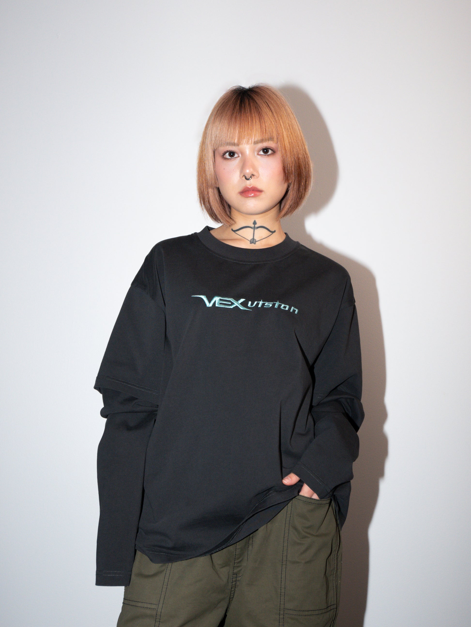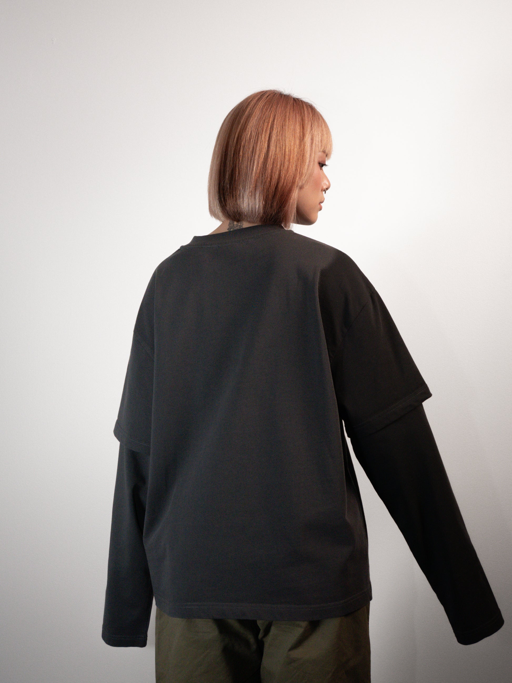This 230gsm 100% cotton double-layer tee is built for that perfect slouchy, oversized feel. The cropped, wide body and extra-long sleeves create an effortless "shirt paws" drape, while the enzyme wash gives it a soft, lived-in texture from day one. Designed with a layered short-sleeve overlap, it delivers a stacked, dimensional look without excess bulk—ideal for year-round wear.