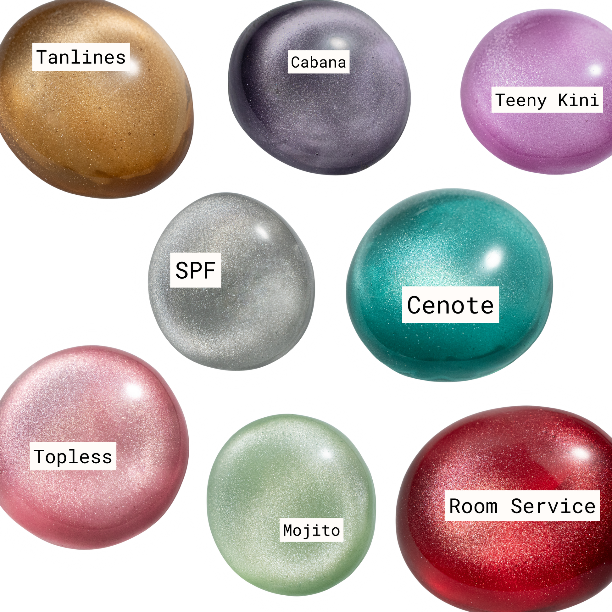 8 sheer jelly colors with 5 micron cateye glitter. Best layered over a sheer nude or milky base. Try layering over nude bases with different undertones to create endless possibilities with this collection.