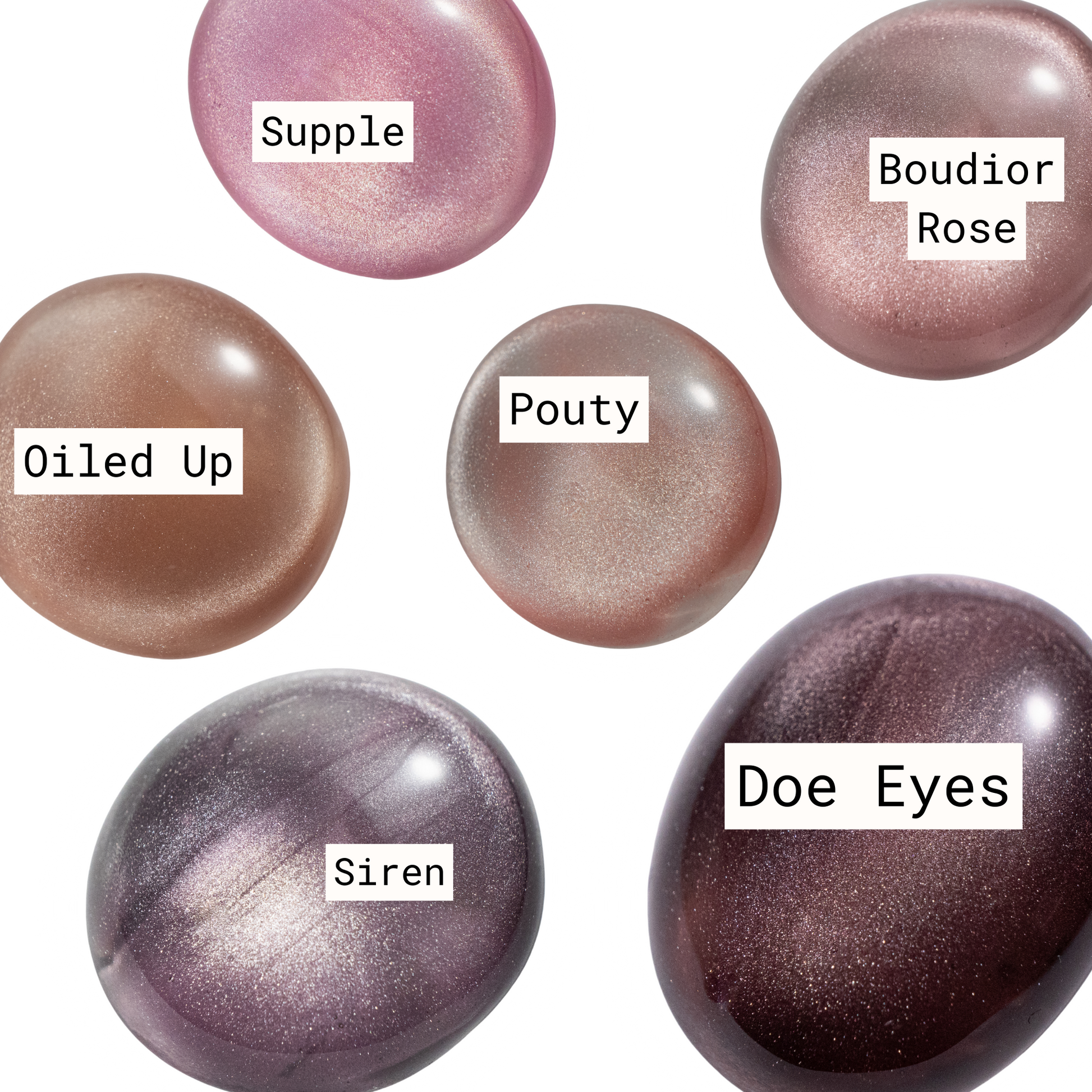 6 sheer jelly colors with 5 micron cateye glitter. Best layered over a sheer nude or milky base. Try layering over nude bases with different undertones to create endless possibilities with this collection.
