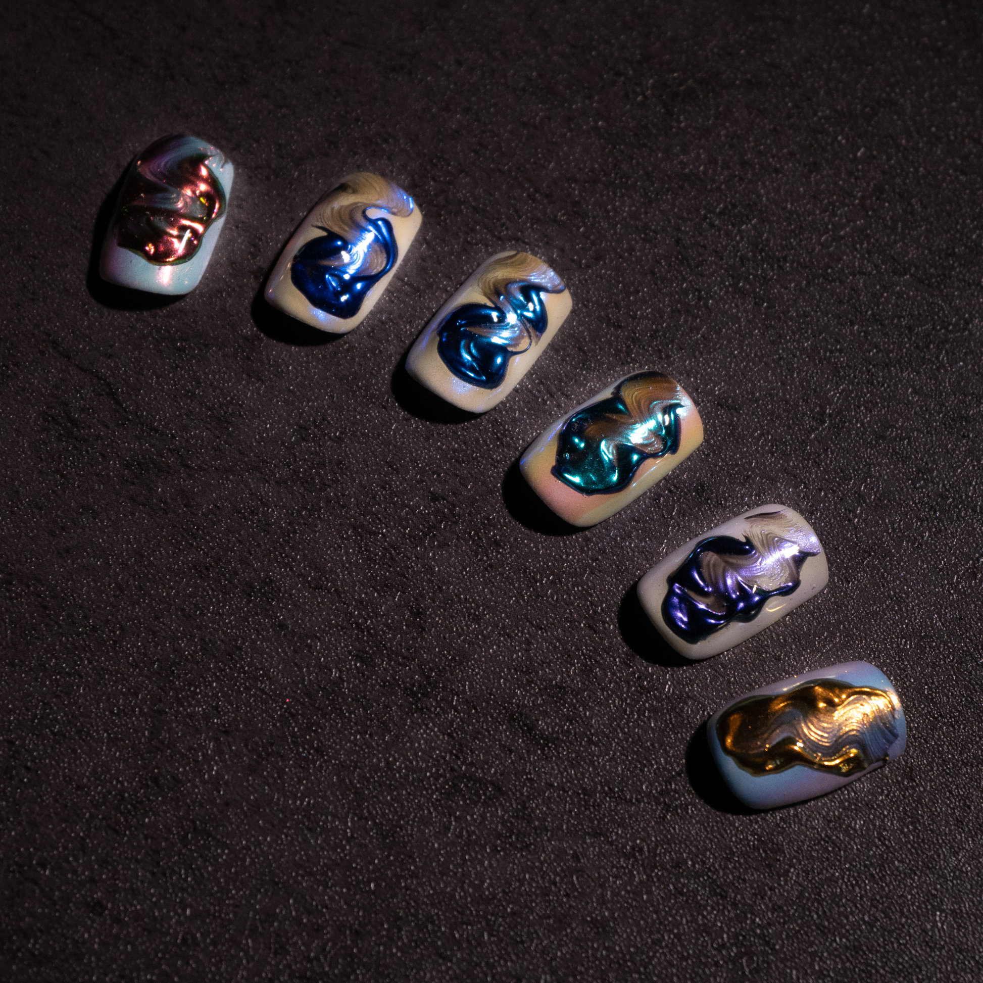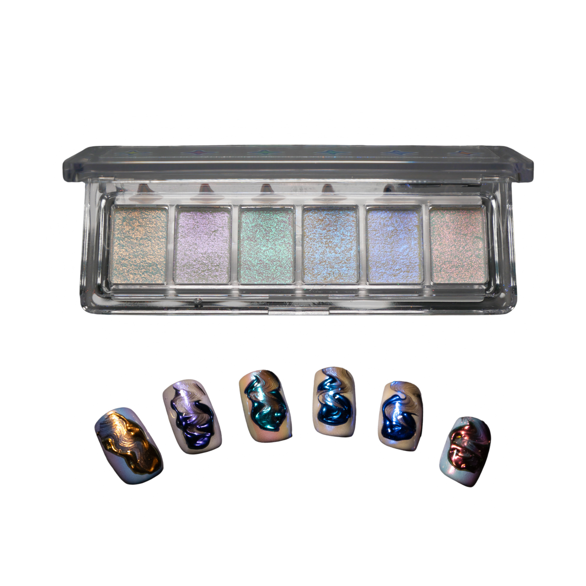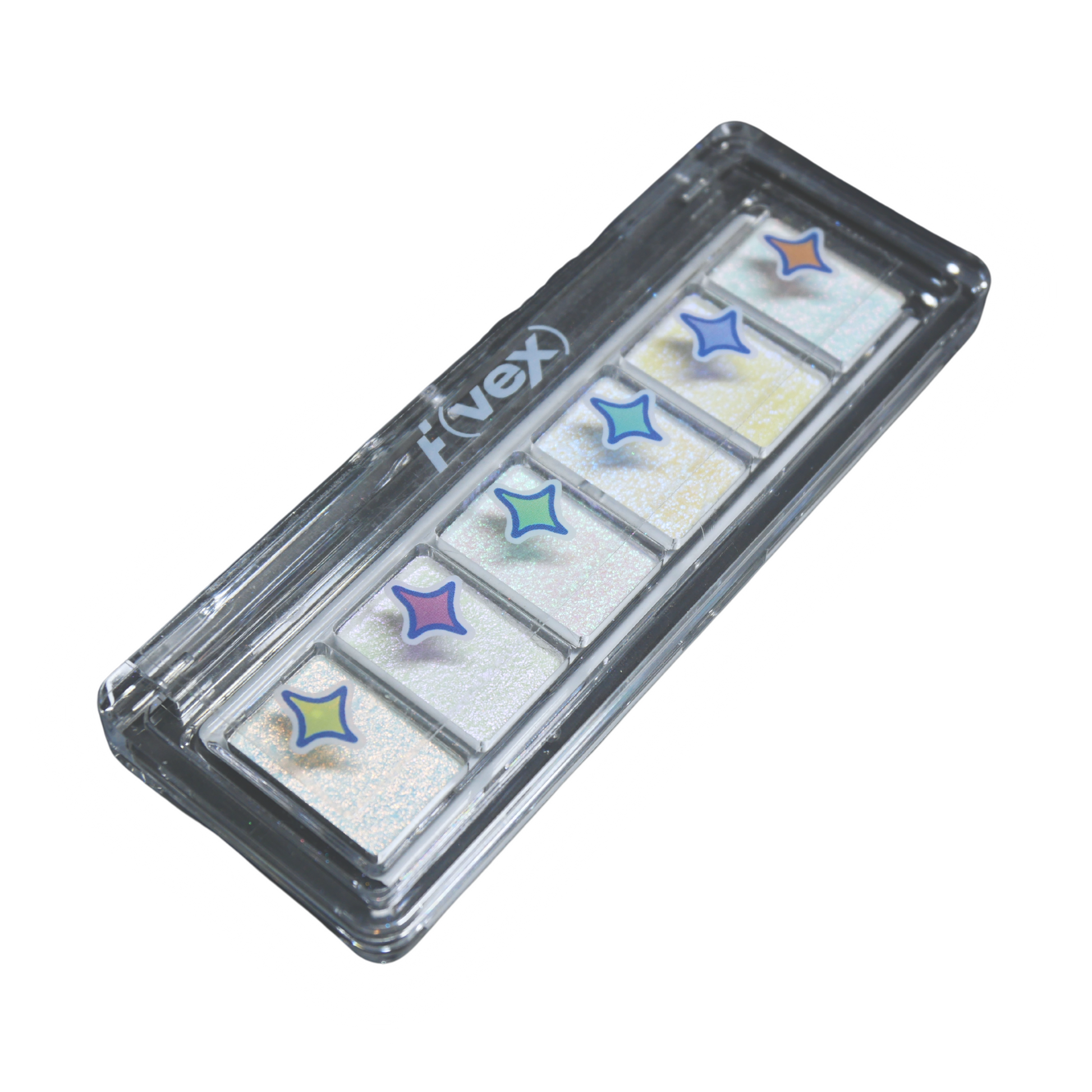 Transparent based iridescent chromes in all the hues you need in one palette. Manic Pixie has all of your commonly used aurora chrome shades in a solid, travel friendly, lung friendly form. No more spilling pigment or huffing it by accident. We only the highest grade cruelty free pigments that are ultra-finely milled in small batches.