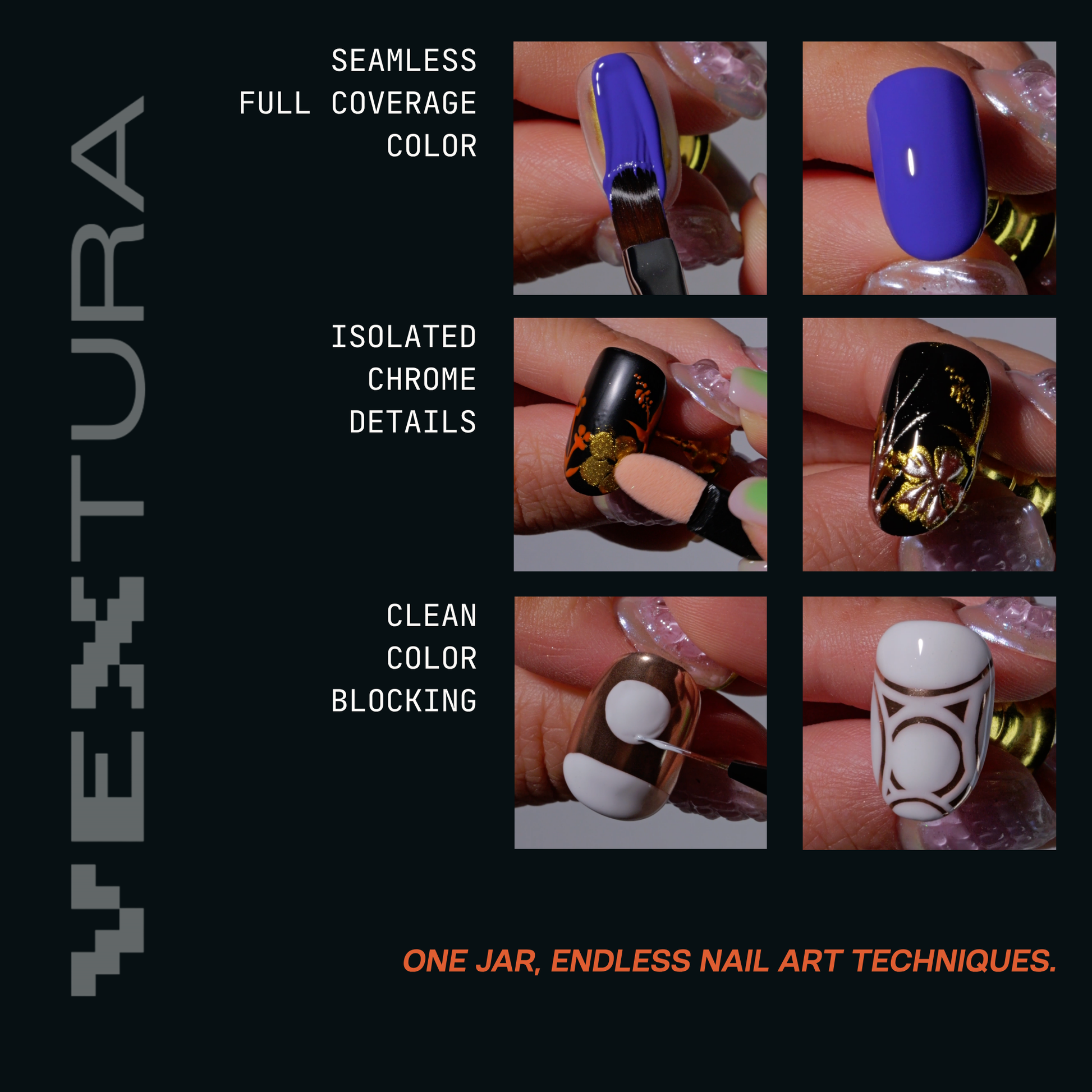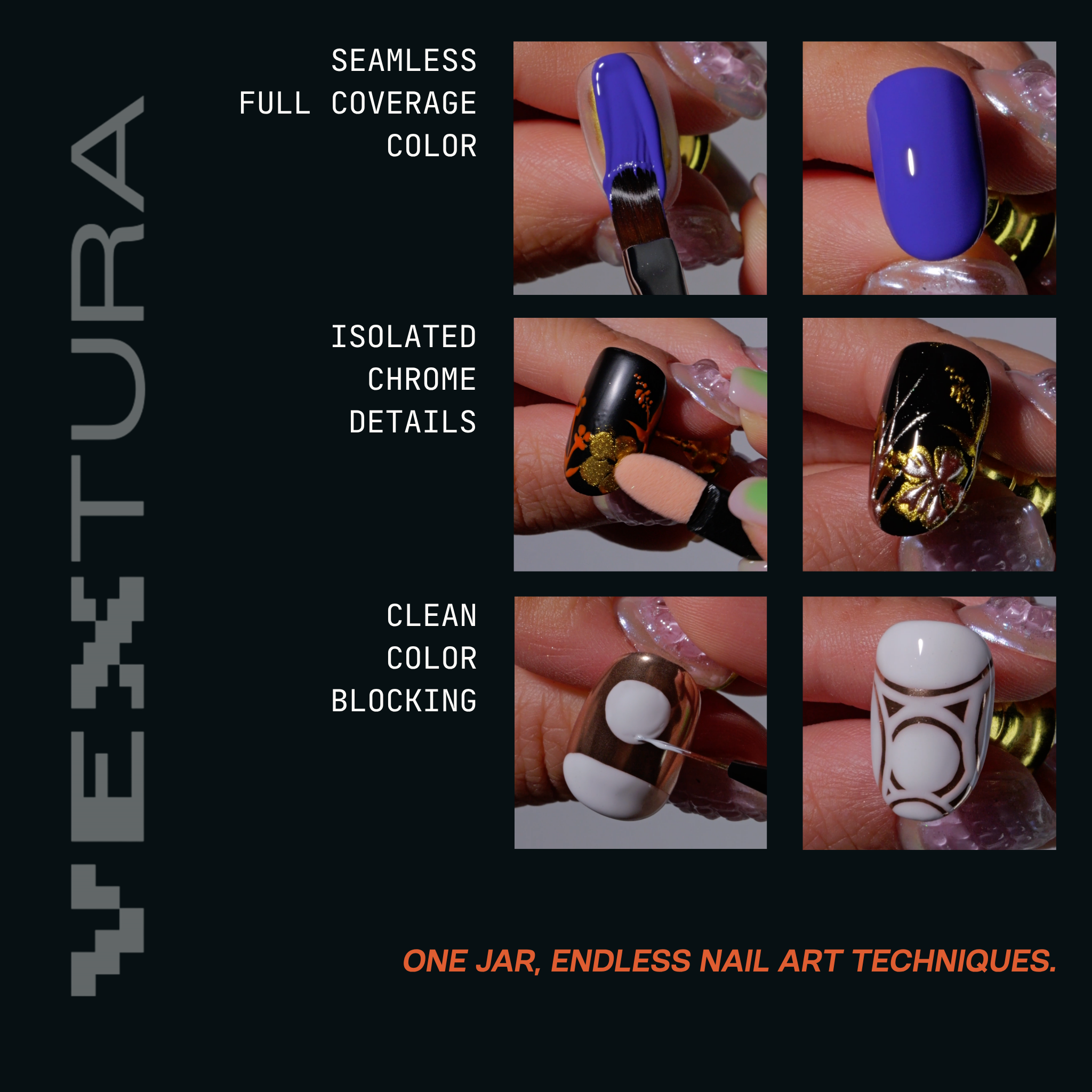 The one jar wonder. Vextura Studio Paint is a multifunctional, high-pigment potted gel designed for every nail artist. Use it for full coverage color, crisp linework, smooth blending, or custom mixing—all from a single jar.